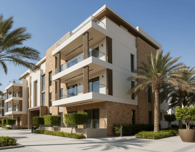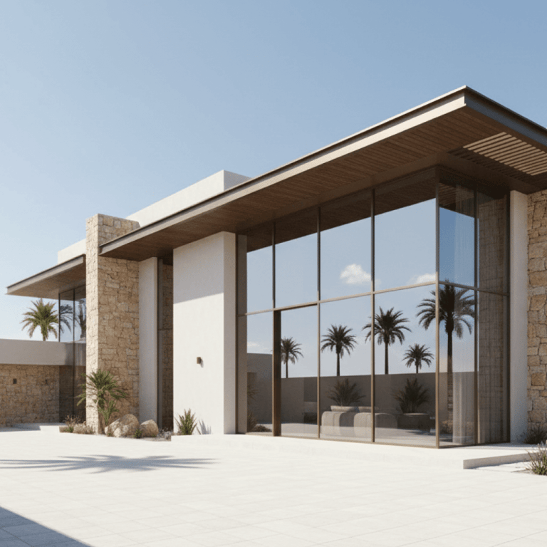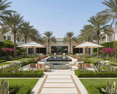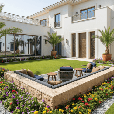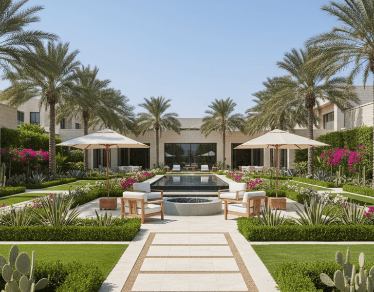 A photorealistic, wide-angle garden landscape showcasing a balanced mix of hardscape elements (stone flooring, walkways, pergola) and softscape (shrubs, palms, native plants). Bright natural lighting, elegant textures, premium materials, and a clean contemporary aesthetic suitable for Ras Al Khaimah villas.